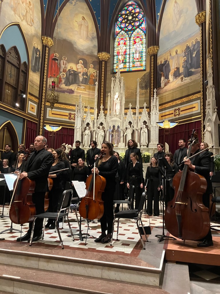 The opening movement, Father, Forgive Them, offered a sensuous and luscious mantra-like quality throughout, with more angular and jarring moments for string orchestra and lower voices. The chorus maintained a strong, heartrending sound in the second and third movements, against a slow crescendo of sound from the strings in the former and a extended duets performed as solos across all eight voice parts in the latter. Some were sung by undergraduates, no less, including powerfully ringing highlights from sopranos Sofiya Chvojka and Savannah Weldon. Movements four through seven were perhaps some of the most inspiring performances ever given, as their harmonic language, including influences from Scottish folk melodies which color much of James MacMillan’s oeuvre, allowed the inner meaning of the story of Christ’s crucifixion on the cross to be brought out in such a way that most other modern works likely wouldn’t otherwise do. This was most evident in the fifth and sixth movements, through the use of stage whispers in the choral parts and slow crescendos to triple or even quadruple forte in the strings. The latter movement being primarily a cappella with cutting interjections from the orchestra representing the hammering of the nails into the cross shows both unrestrained beauty and sheer horror. The final movement was spine-tingling and hypnotic in its power and desolation.